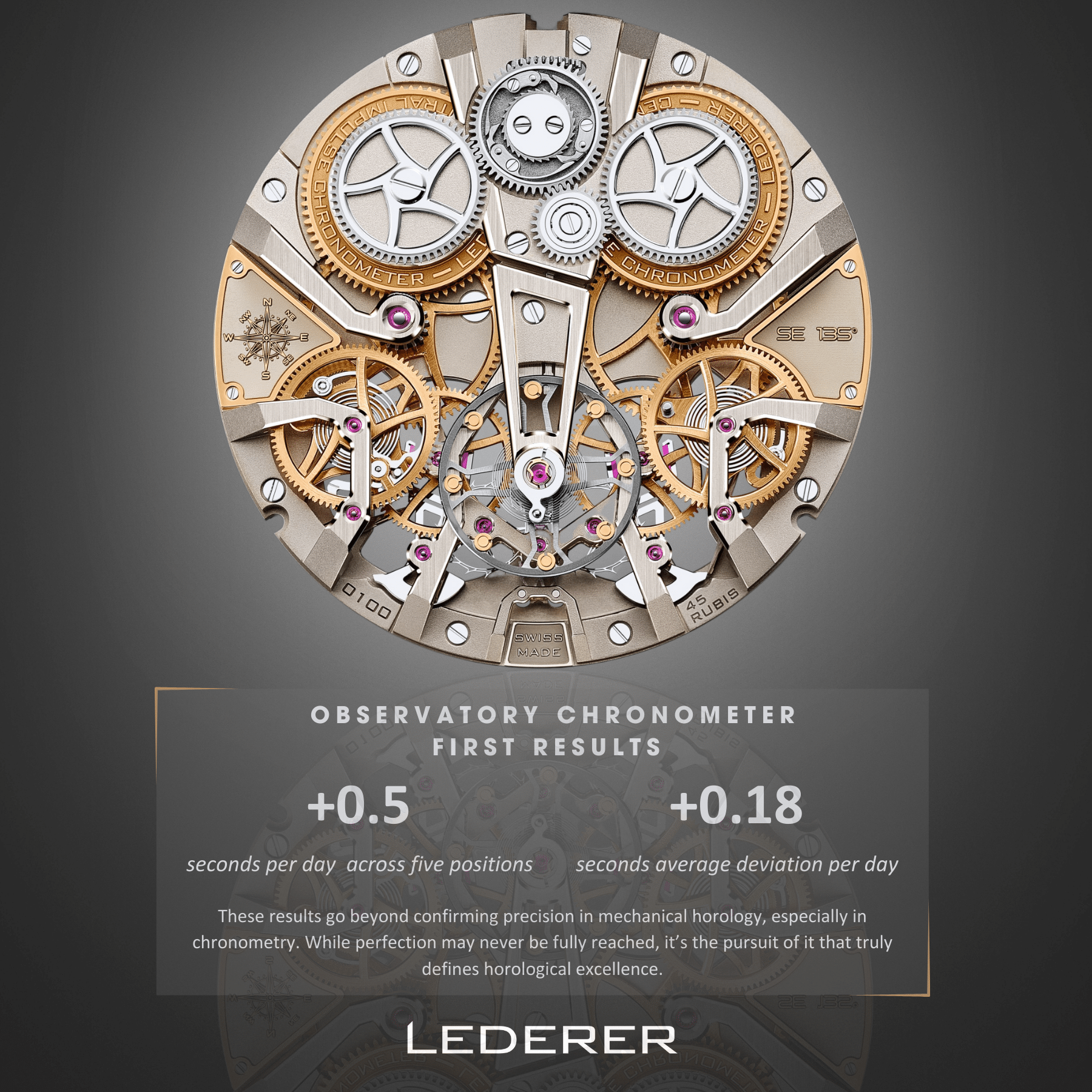 레더러는 이 시계의 정밀성에 대해 5개의 자세에서 최대 일오차 +0.5초, 일일 평균 편차는 +0.18초라는 경이로운 기록을 보여주며 뽐내고 있습니다. 이렇게 정밀한 시계를 만들기 위해서 이 시계에는 CIC(central impulse chronometer) concept을 적용한 Cal.9012라는 무브먼트를 사용했는데요. 이 Cal.9012는 과거 아브라함 루이 브레게가 고안하고, 전설적인 워치메이커 조지 다니엘스가 개량한 '내추럴 이스케이프먼트'를 사용한 굉장히 흥미로운 무브먼트입니다.