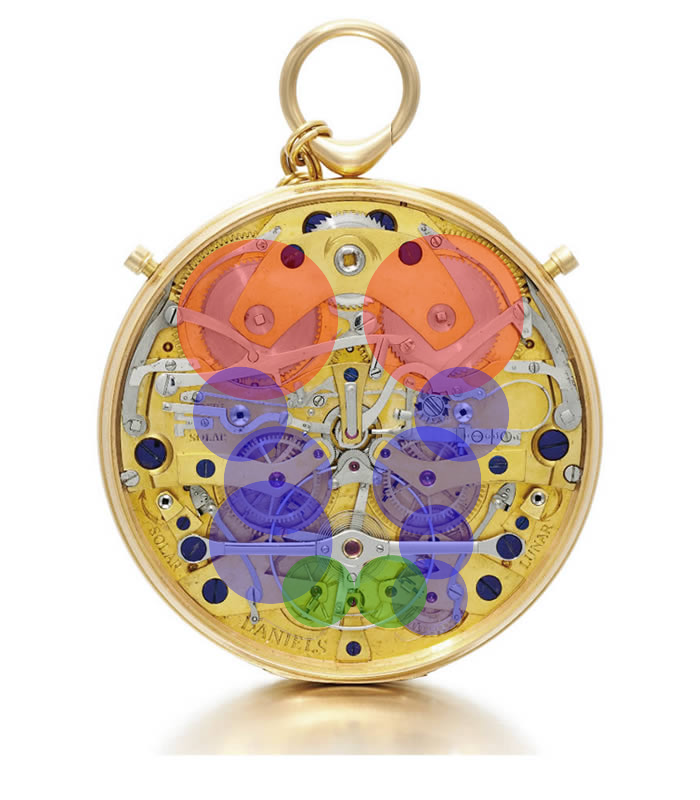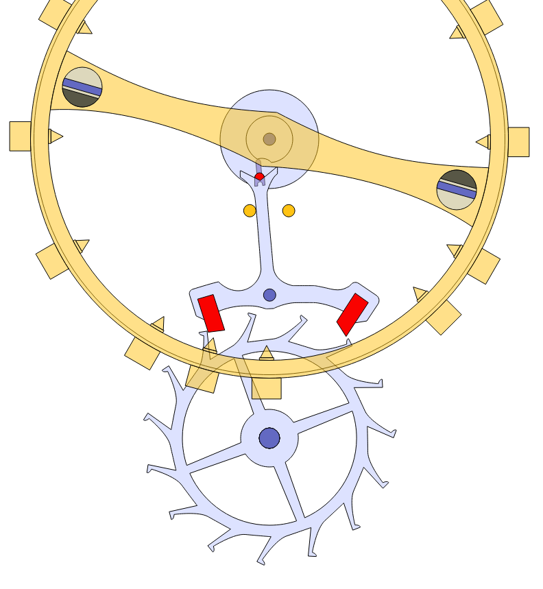 2개의 이스케이프 휠(초록색)이 서로 간섭하지 않기 때문에, 각 기어트레인(파란색)은 메인스프링으로(빨간색)부터 동력을 받아 밸런스 휠에 직접 동력을 전달합니다. 차례대로 말이죠. 이 과정을 반복하면서 항상 한 틱에 한번의 휠만 움직이면 되기 때문에 에너지 효율이 극적으로 올라갑니다.