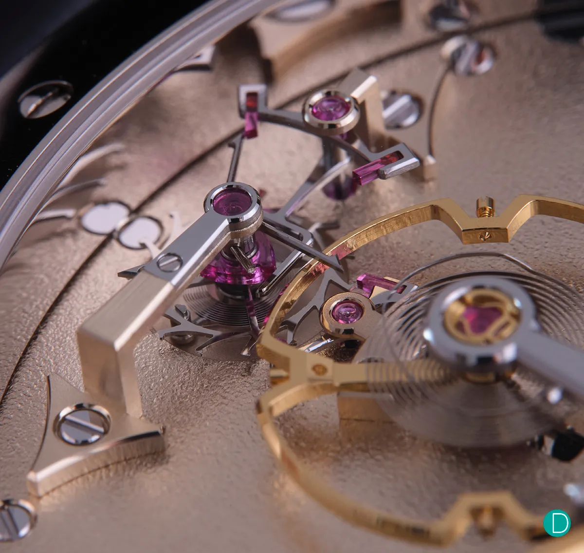 레더러는 저 데탕트를 '메트로놈'이라고 부릅니다. 메트로놈의 움직임을 떠올려본다면 적절한 이름입니다. 레더러의 메트로놈은 두 가지 유형의 팔렛을 조합한 구조입니다. 먼저 각각의 이스케이프 휠에 연결된 임펄스를 전달하는 두 개의 팔렛이 있고, 중앙에는 두 이스케이프 휠과 작동하는 '대기 팔렛'이 있습니다. 임펄스를 제공할 이스케이프 휠은 이 대기 팔렛이 풀릴 때까지 기다린 후 밸런스에 에너지를 전달하게 됩니다. 이 대기 팔렛에는 약간 곡선 형태의 면이 있어, 이스케이프 휠이 백래시에 빠지지 않도록 하면서도 즉시 올바른 회전을 재개할 수 있도록 설계되어 있습니다. 즉, 시계가 구동되기 시작할 때는 스위스 레버시스템과 같이 간접적으로 임펄스를 전달하는 거죠,