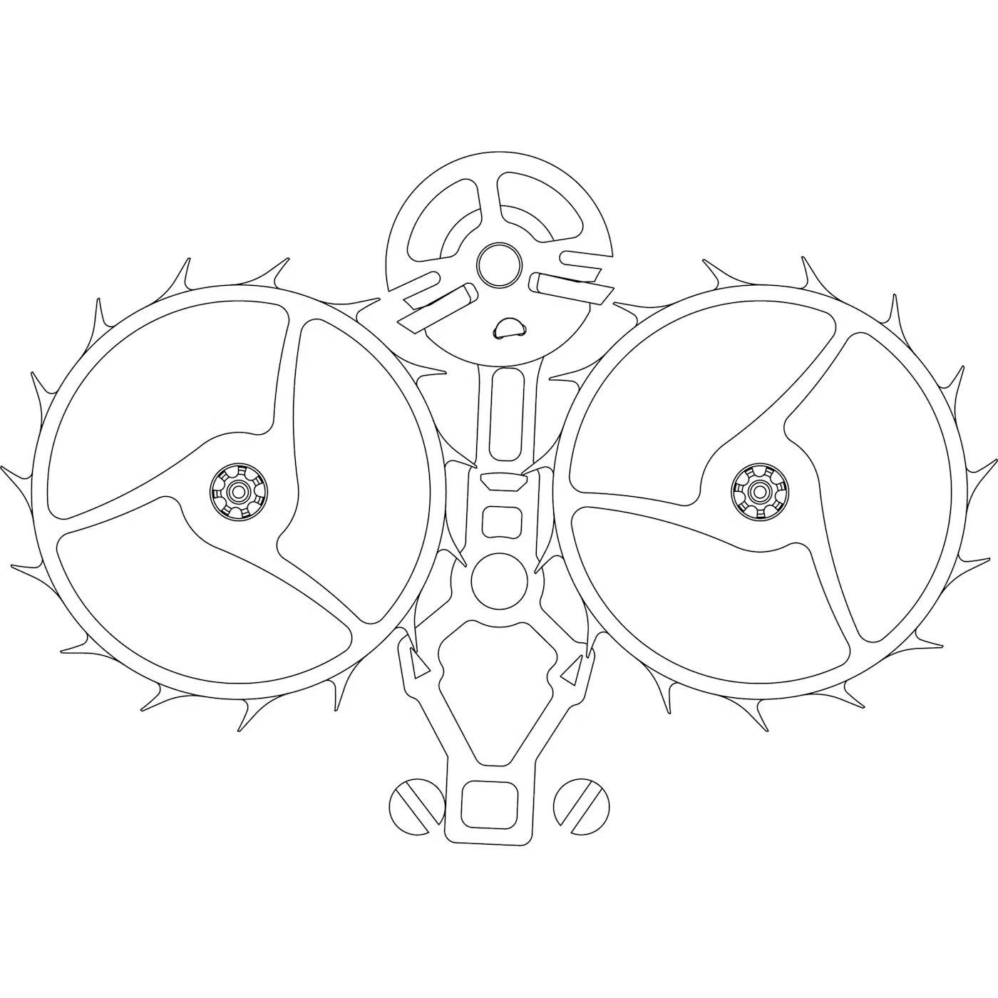 바로 위 사진의 '스페이스 트레블러'라는 시계인데, 여러 이야기를 차치하고 하나의 개선점을 얘기하자면 원래 하나의 배럴 스프링을 연결해 4번 휠까지 돌리기 위해서 16배의 동력이 필요했던 구조적인 문제를 고치기 위해 두 이스케이프 휠에 각각 배럴 스프링을 배치했다는 겁니다.