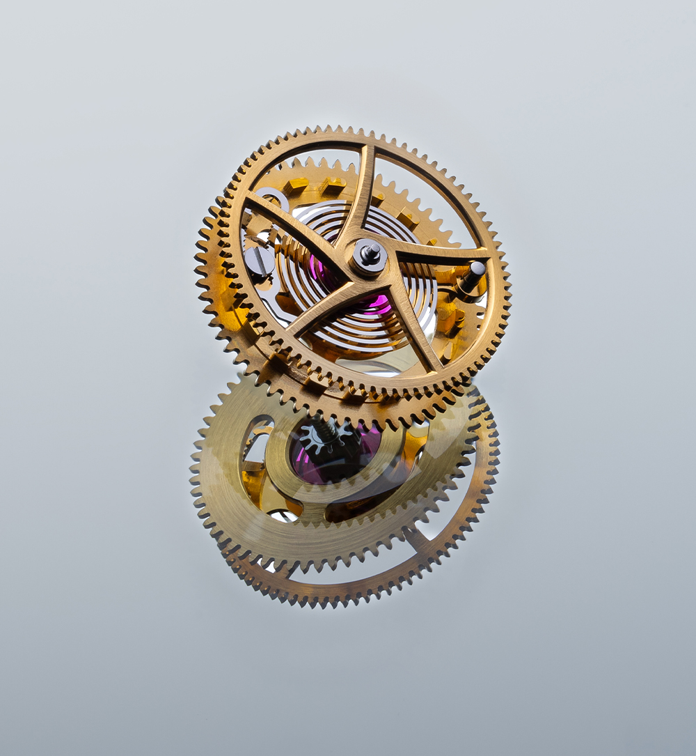 “무브먼트의 구조를 바꿔야 했습니다. 두 초침이 항상 정렬 상태를 유지하게끔 만들기 위해서요. 그래서 작은 메커니즘을 하나 만들어, 시분침을 구동하는 레몽투아 안에 집어넣었습니다. 이 레몽투아는 항상 먼저 에너지가 고갈되도록 설계되어 있습니다. 그리고 이 레몽투아가 더 이상 작동할 수 없는 순간이 오면, 작은 스프링이 튀어나와 밸런스를 멈추게 합니다. 즉, 이 레몽투아가 제 역할을 다할 수 있는 동안만 시계가 작동하게 되는 것이죠.”